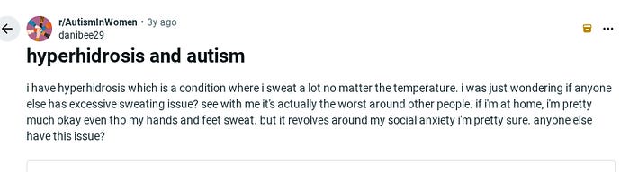 A Google search for hyperhidrosis and autism yielded this thread from the Autism in Women Reddit page, with dozens of commenters weighing in about their own experiences.